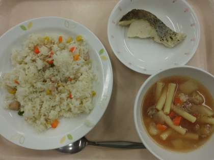 三色ピラフ・牛乳・たらの香草焼き・ミネストローネ