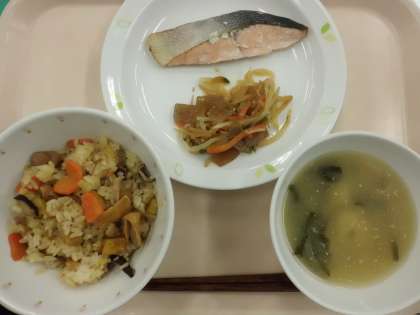 秋の香りごはん・牛乳・鮭の塩こうじ焼き・こんにゃくサラダ・すりごまのみそ汁