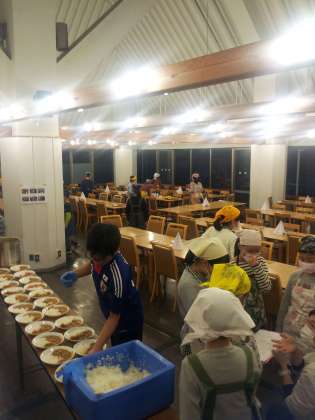 飯ごう炊さんが無くなり、調理場の人が作ってくれました。食事係が準備を頑張っていますね。