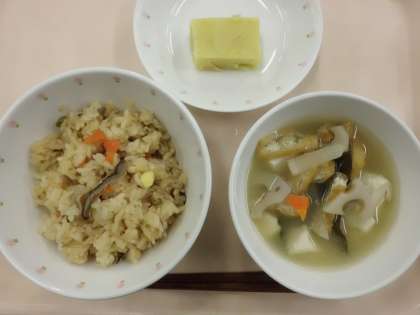 吹き寄せごはん・牛乳・根菜のみそ汁・いもようかん