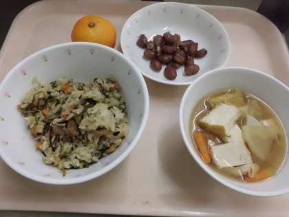 磯おこわ・牛乳・けんちん汁・煮豆・くだもの