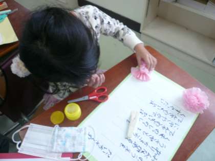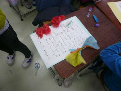 学習発表会で覚えた「のはらうた」の中から、自分が好きな詩を一つ選んで書き、額縁を花紙で飾りました。色画用紙に貼ったのはらうたの詩が、花紙によってもりもりにデコレーションされています。保護者会の際に、ぜひご覧ください。