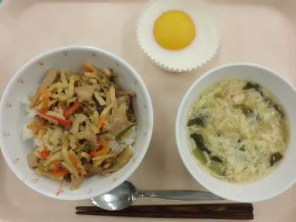 チンジャオロース丼・牛乳・サンラータン・おかしな目玉焼き