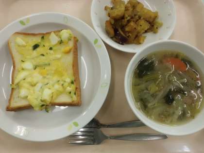 たまごトースト・牛乳・ベーコンと白菜のスープ・りんご大学芋