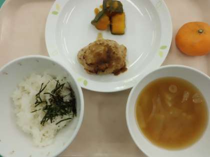 ごまのりごはん・牛乳・豆腐ハンバーグ・かぼちゃの煮物・みそ汁・くだもの
