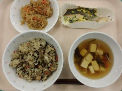 ひじきごはん・牛乳・菜種焼き・切り干し大根の煮つけ・すまし汁