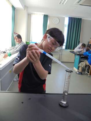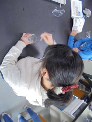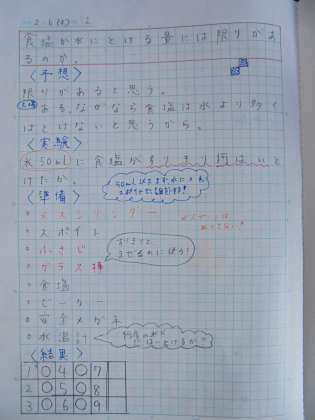 理科では「もののとけ方」を学習しています。まずは「メスシリンダーの使い方」と「すりきり1はい」を練習し、50mlの水に食塩は小さじ何はいとけるのか、実験しました。
