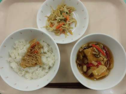 麦ごはん・牛乳・なめたけ・厚あげ豆腐の野菜あんかけ・ごま酢かけ
