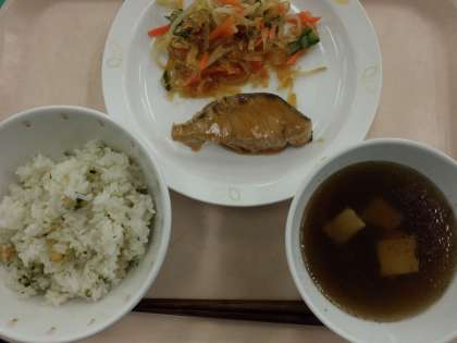 豆ごはん・牛乳・ぶりの照り焼き・糸寒天と野菜のあえもの・けんちん汁
