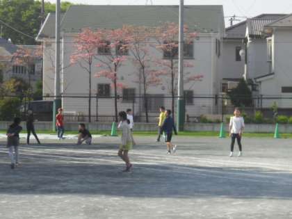始業前の校庭で友達との朝遊びが始まりました〜。