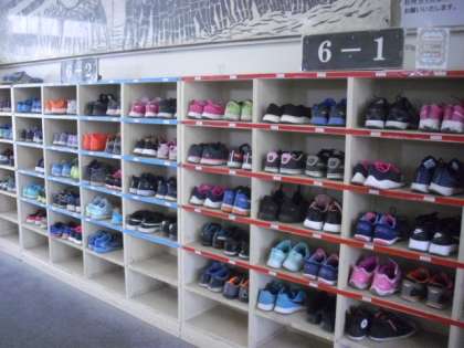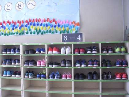 6年生の靴箱、どのクラスもきちんと靴がそろっています。