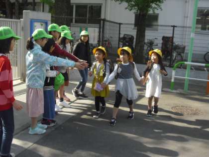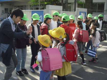 6年生のお兄さんお姉さんがやさしく声掛け、今日はハイタッチでお出迎え〜