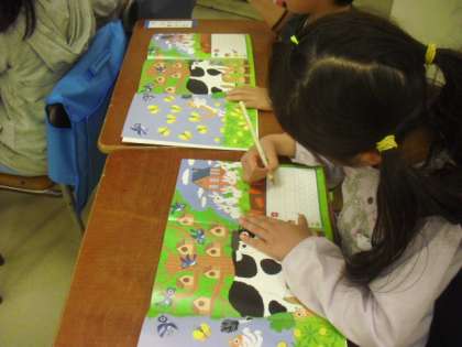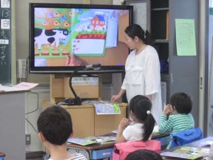 大型画面に先生が教科書の挿絵を映し、わかりやすく提示していました。