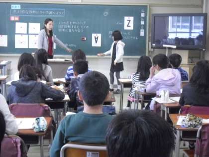 対称な図形についての理解を深める習熟度別指導です。今日は学習したことをいかし、アルファベットの中から、線対称な図形、点対称な図形を選んでいました。