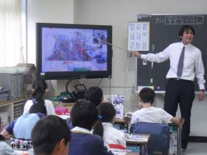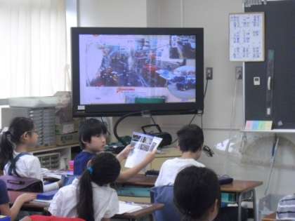 大型画面で挿絵を手掛かりに、人々の安全をまもる仕組みについて学習していました。みんな気付きをたくさん発表していました。