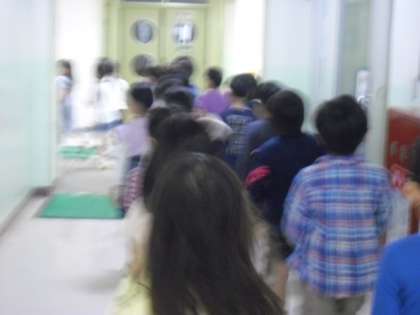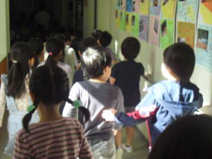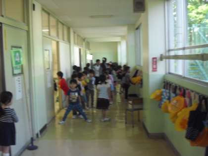 1年生がみんなで声をかけ、廊下に並んでいました。
