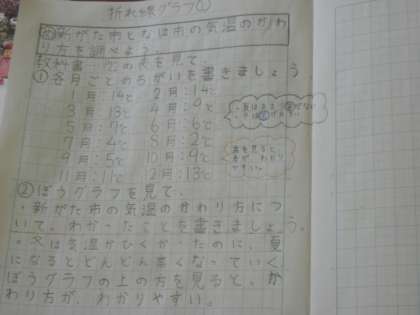 折れ線グラフから読み取った特徴や傾向について発表することを通し、折れ線グラフで表すことのよさを感じていました。
