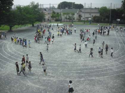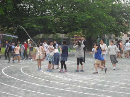 縄を回すひと、跳ぶタイミングを教え合って、各クラスで楽しく長縄とびをしています。