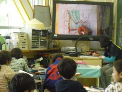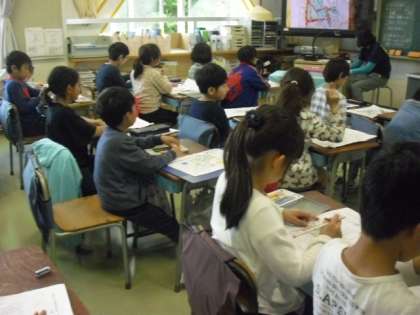 学校の北には?南には?西や東には?・・・と絵地図に記入しながら、自然の多いところ、住宅の多いところ、お店のあるところなど、私たちの住む町の特徴について学んでいました。