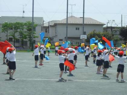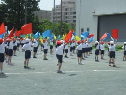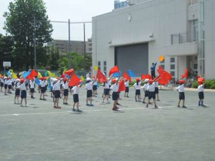カラフルな旗を振って大きな動作で頑張っています・・・・