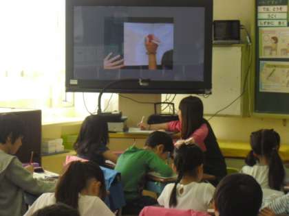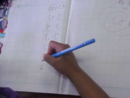 先生の大型画面に映るお手本を見てノートに丁寧に書いていました。
