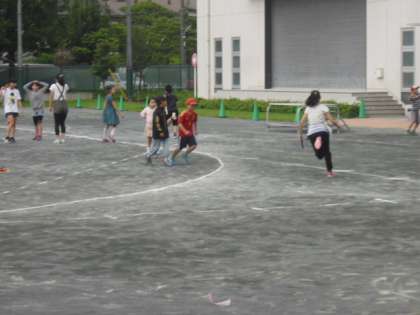 昨年上級生に教えてもらった経験のある6年生が、今年は5年生にバトンパスの仕方を伝授〜