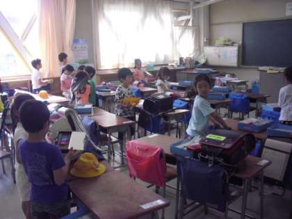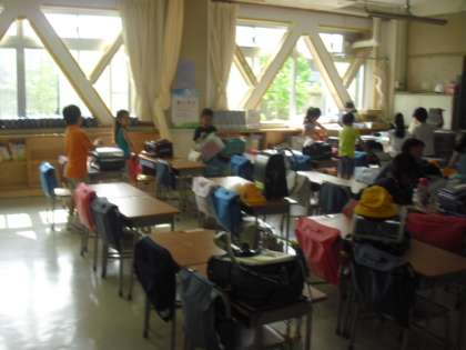 登校し、4月当初6年生のお世話をしてもらっていた1年生も、自分でしっかりと荷物を机に入れ、ランドセルを片付けていますよ〜。すっかり小学生になりましたね〜