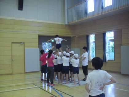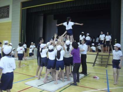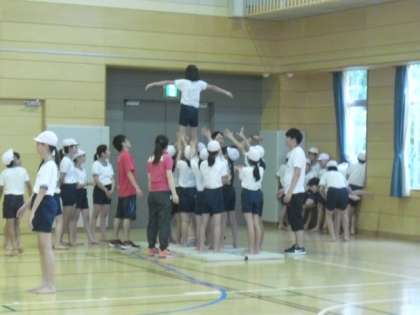 新組体操の中の技の練習です。体育館にマットを敷き、マットの上で、先生のサポートのもと練習しました〜