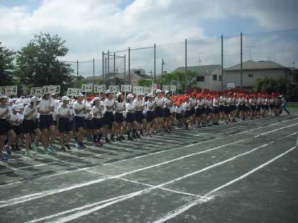 プラカード係を先頭に整列して入場行進の練習です。