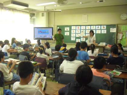 英語活動支援員の先生と担任の先生とのティームティーチングで学習が進んでいました。今日は好きな食べ物について、どのように伝えるのか、学習しました。