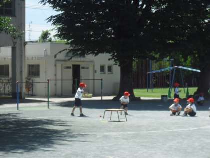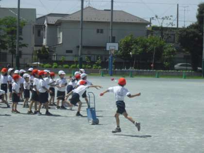 今日は的あての活動に向けて、紅白の玉を使って投げる練習をしました。