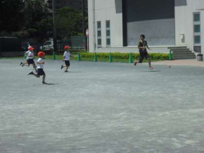 1年生では、簡単なボール操作などで的に当てるゲームや攻めと守りのあるゲームを行います。