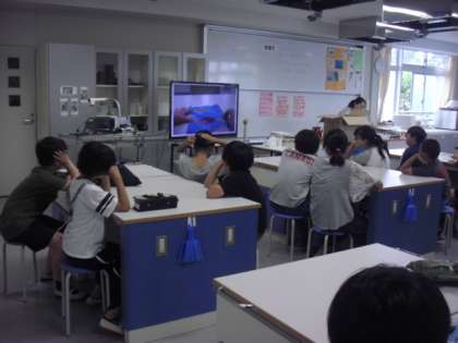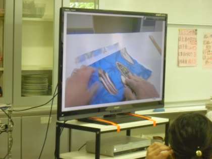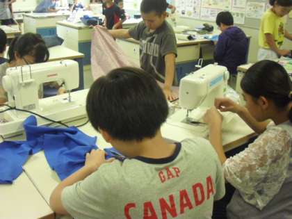 先生の解説を大型画面で聞きながら、手順を確認し、手縫い、ミシン縫いをして進めていました。
