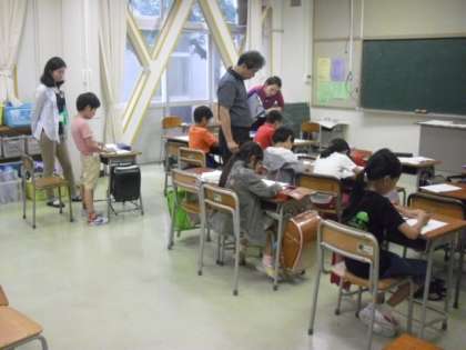 先生たちが指導にあたり、千歳小サポート隊の皆様に、答え合わせをお願いしています。「できた」「わかった」という子どもたちの頑張りがたくさんみられました〜。