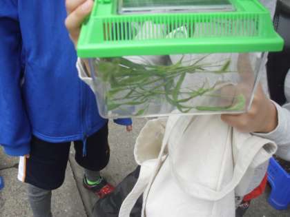 子どもが大事そうに抱えている虫かごには、バッタが入っていました〜