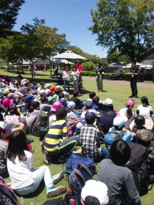 村巡りをし、果樹園でりんごについて学習しました。そして田園プラザに到着〜これからお弁当タイムです。