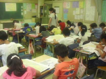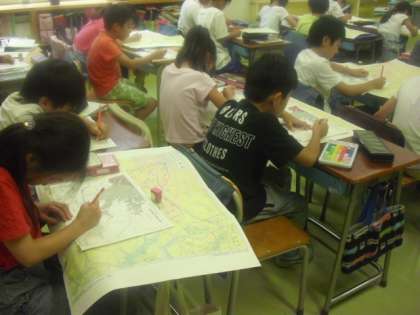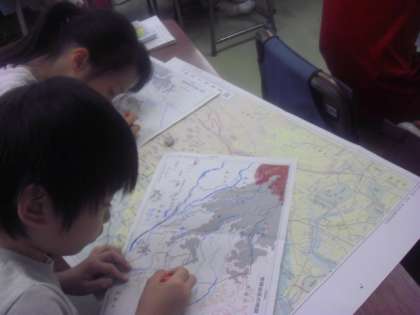地図を広げて土地の高さの様子についての学習です。