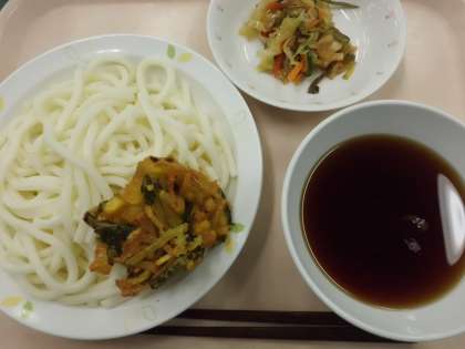 冷やしつけめん・牛乳・ゴーヤとコーンのかきあげ・くきわかめのサラダ
