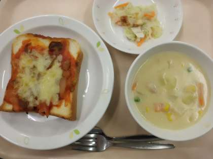 ピザトースト・牛乳・コーンシチュー・シーザーサラダ