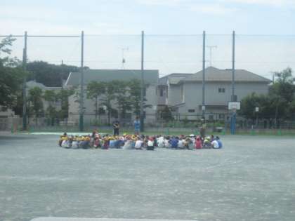放送の間、校庭では真ん中に集まり静かに入れが収まるのを待ちました。