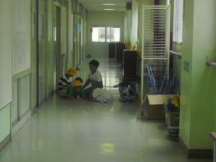 廊下でも作業をやめて、しゃがみました。