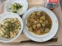 冷やし中華・牛乳・コーンポテト・くだもの(すいか)