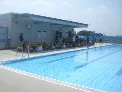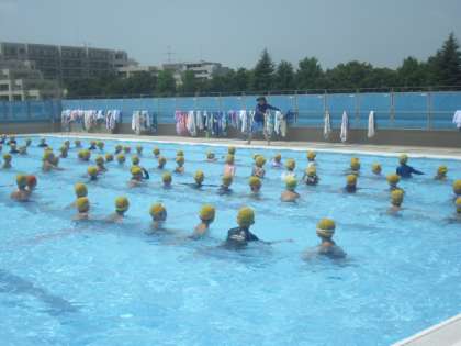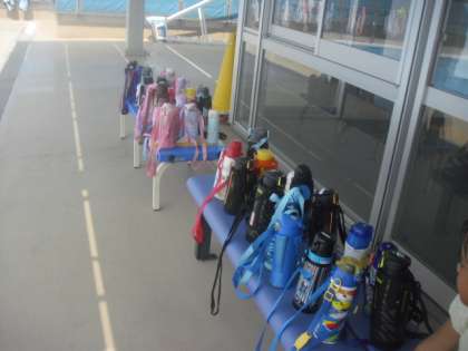 水分補給に備え、水筒もプールサイドに整列・・・・