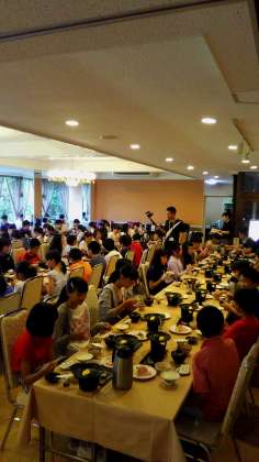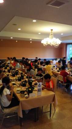 朝会の後、朝食をとりました。食事係が食事の挨拶とともに今日の過ごし方について皆に伝えています。