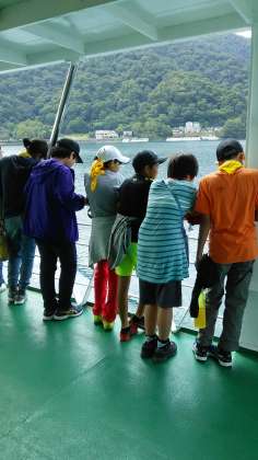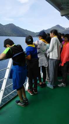 中禅寺湖でクルージングです。景色のよさを楽しんでいます。中禅寺湖畔は空気がからっとしていて涼しく感じます。