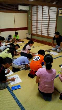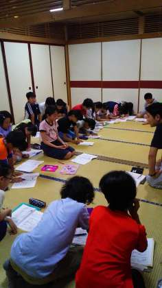 予定を早め、夕食の後に室長会議を行いました。部屋のメンバーに明日の出発までの予定もしっかり伝える活動しています。この後は 子どもたちも楽しみにしている肝だめしです。