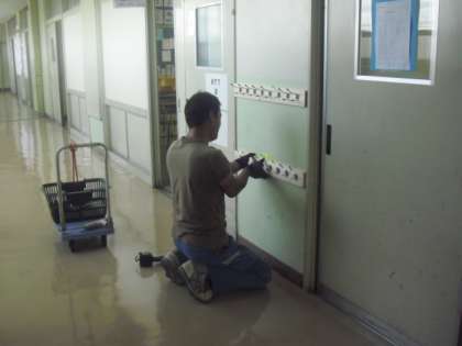 主事さんの一つ一つ手作りのフックを、今日も廊下に取り付けています。