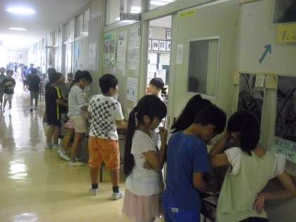 休憩時間には、みんなで夏休みの作品を見合っています。