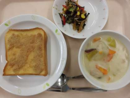 セサミトースト・牛乳・さつまいもシチュー・大根とひじきのサラダ
