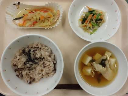 赤飯・牛乳・鮭のチャンチャン焼き・菊花入りおひたし・ゆばのすまし汁